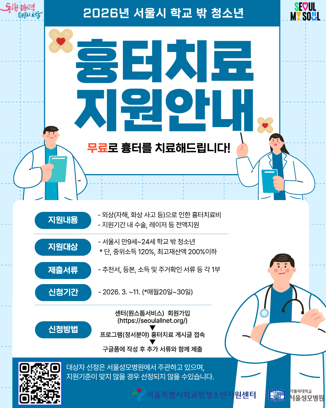 서울특별시학교밖청소년지원센터와 가톨릭대학교 서울성모병원은 흉터로 인해 심적 어려움을 호소하는 학교 밖 청소년을 대상으로 흉터치료비 지원사업을 진행합니다.