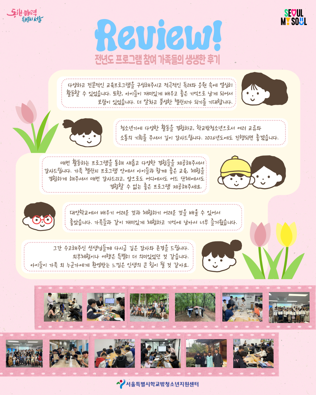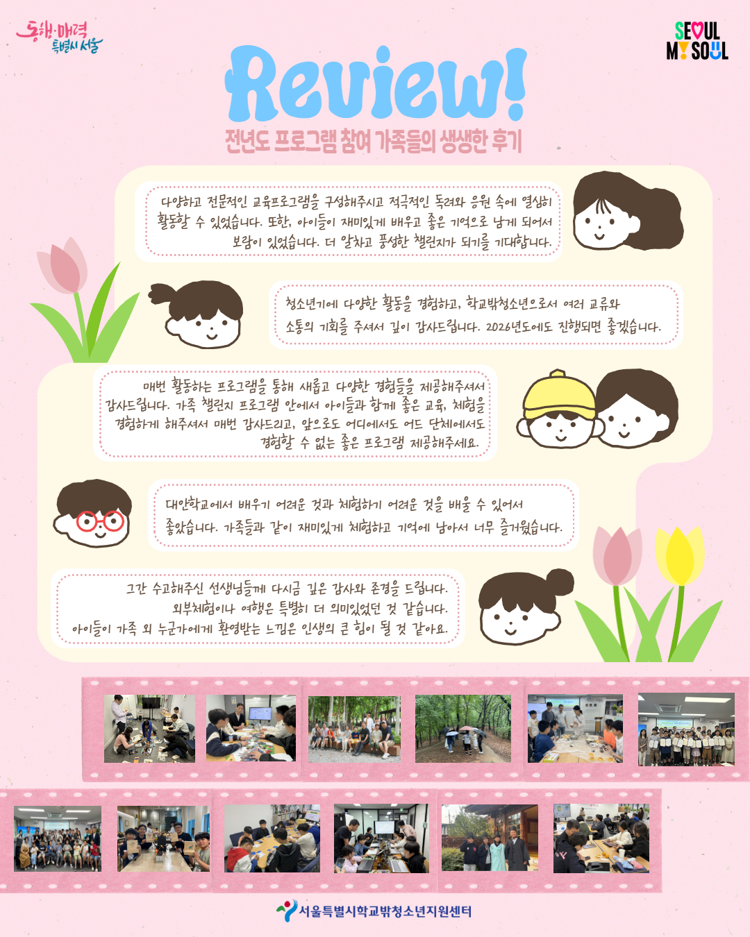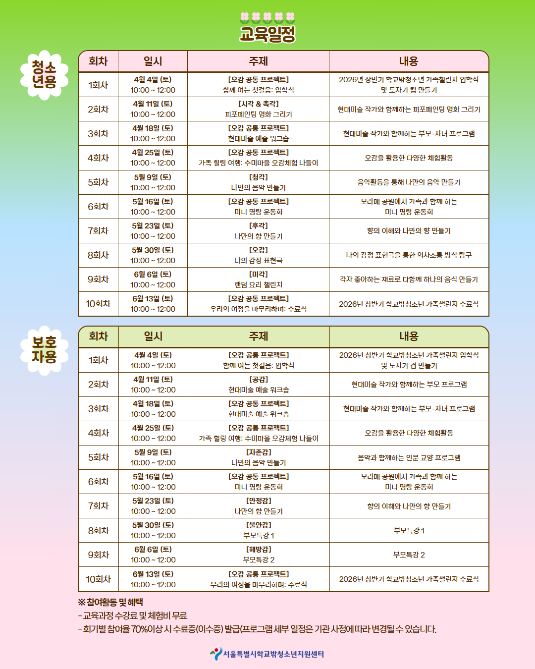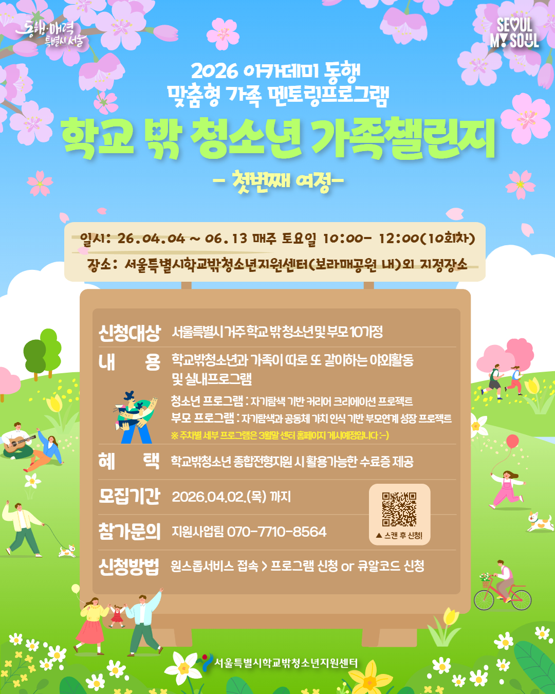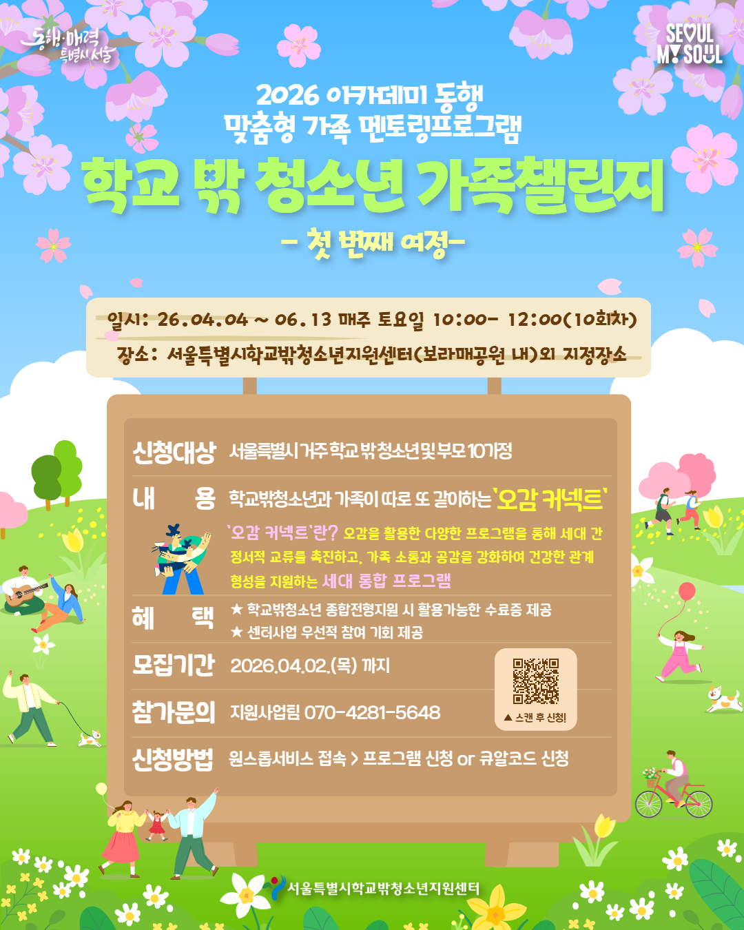 프로그램 신청 HOME > 프로그램 > 프로그램 신청 링크공유 프린트 아카데미동행 학교밖청소년가족챌린지 첫번째여정 대상 학교밖청소년 및 보호자 10가정 모집 인원 10가정 프로그램 기간 2026-04-04 ~ 2026-06-13 [토]10:00~ 12:00 신청 기간 2026-03-13 ~ 2026-04-04 장소 서울특별시학교밖청소년지원센터 방식 오프라인 원스톱 프로그램 내용 신청완료 설문지 "제출" 완료 후에 "신청완료" 버튼을 눌러 신청 해주세요. 첨부파일 프로그램 신청 목록