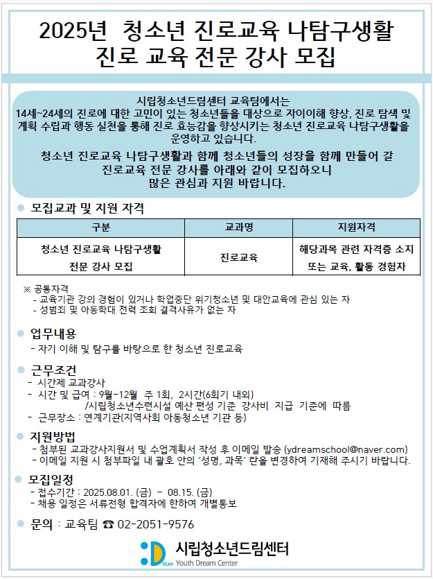 1. 개인정보의 이용 목적 : 학교 밖 청소년 지원 서비스 안내, 사업실적보고, 만족도조사