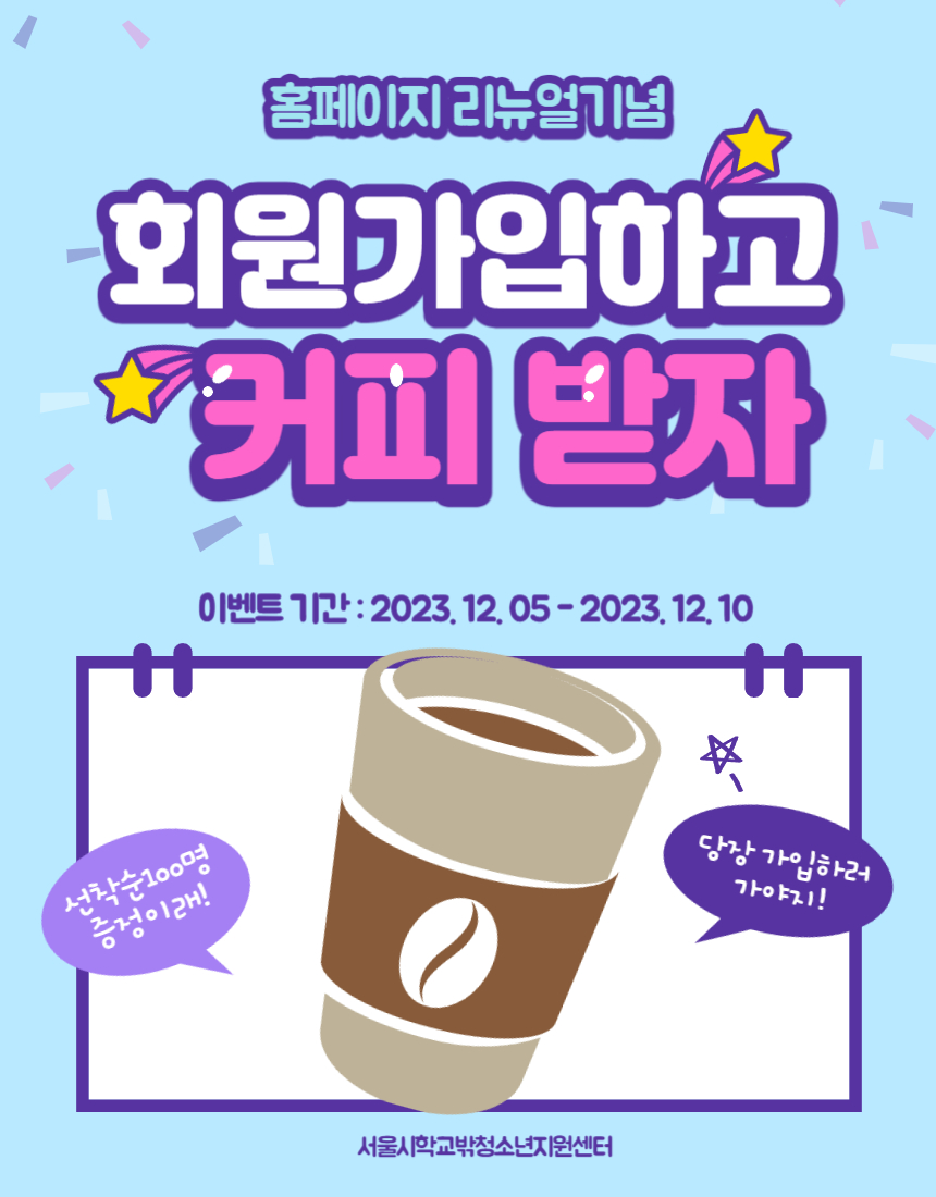 공지사항 HOME > 커뮤니티 > 센터 소식 > 공지사항 링크공유 프린트 [회원가입이벤트] 회원가입하고 커피 기프티콘 받자! 관리자 0 757 0 0 Print 글주소 12-05 회원가입 이벤트 상품이 바나나우유 -> 메가커피 기프티콘으로 변경되었습니다. 12/5일 이후 가입하신분들은 변경된 상품으로 보내드립니다. 감사합니다 :) 0 0 스크랩 목록 이전글 다음글 제목+내용 제목 내용 회원명 회원아이디 번호 제목 글쓴이 날짜 조회수 공지 정책단 '다움' Crew 모집 안내 관리자 02-23 54 공지 2026년 학교 밖 청소년 인식개선 온라인 이벤트 1차 관리자 02-12 359 공지 [서울특별시학교밖청소년지원센터] 찾아오는 길 안내_보라매공원역편 관리자 08-25 2,929 452 2024년 학교 밖 청소년 문신제거 지원 선정자 알림 관리자 04-11 465 451 2024년 학교 밖 청소년 건강검진 지원 선정자 알림 관리자 04-11 474 450 [센터소식] 보호처분청소년 사회적응 능력 향상을 위한 예방교육 실시 관리자 04-08 912 449 [센터소식] 학교 밖 청소년을 위한 후원물품 지원 관리자 04-08 1,440 448 2023년 서울특별시학교밖청소년지원센터 시보조금 결산내역서 관리자 03-29 420 447 [센터소식] 서울특별시여성능력개발원과 업무협약(MOU) 체결 관리자 03-28 1,946 446 [모집] 2024년 인턴십프로젝트지원사업 참여청소년 모집 안내문 관리자 03-27 1,538 445 [모집] 2024년 인턴십프로젝트지원사업 현장배움터 모집 안내문 관리자 03-27 957 444 [센터소식] 2024 서울특별시학교밖청소년지원센터 삼육보건대학교 업무협약 체결 관리자 03-26 928 443 [재공고] 2024년 멘토그룹강화사업 참가자 모집 안내문 관리자 03-22 2,048 442 [센터소식] 2024 서울특별시학교밖청소년지원센터 사업 설명회 성료 관리자 03-13 903 441 서울시학교밖청소년지원센터 2024년 예산내역 공고 관리자 02-23 861 440 2023년 서울특별시학교밖청소년지원센터 하반기(7~12월) 수의계약 내역 관리자 01-02 505 439 [회원가입이벤트] 회원가입하고 커피 기프티콘 받자! 관리자 12-05 758 438 서울시학교밖청소년지원센터 2023년 전용 예산내역 공고 관리자 11-17 883 437 센터 스틸패널방수 및 외벽 방수 공사 공고 관리자 11-13 547 436 서울특별시학교밖청소년지원센터 신임 센터장 취임 알림 관리자 10-13 1,120 435 서울특별시학교밖청소년지원센터 위탁법인 변경 안내 관리자 10-13 1,020 434 [유형별테스트]어서와 학교밖센터는 처음이지? 관리자 09-22 860 433 2023년 1호 서울특별시학교밖청소년지원센터 뉴스레터 관리자 09-01 1,112 목록 <12345678910>맨끝 ›