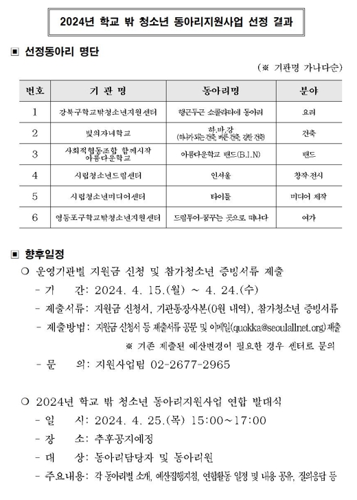 2024년 학교 밖 청소년 동아리지원사업 선정결과 안내