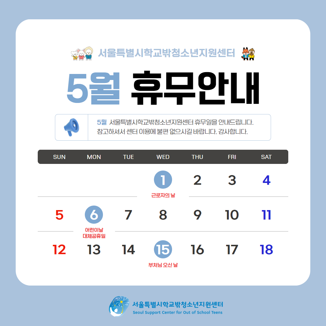 459 [센터소식] 2024년 5월 센터 휴무일 안내 관리자 04-30 891