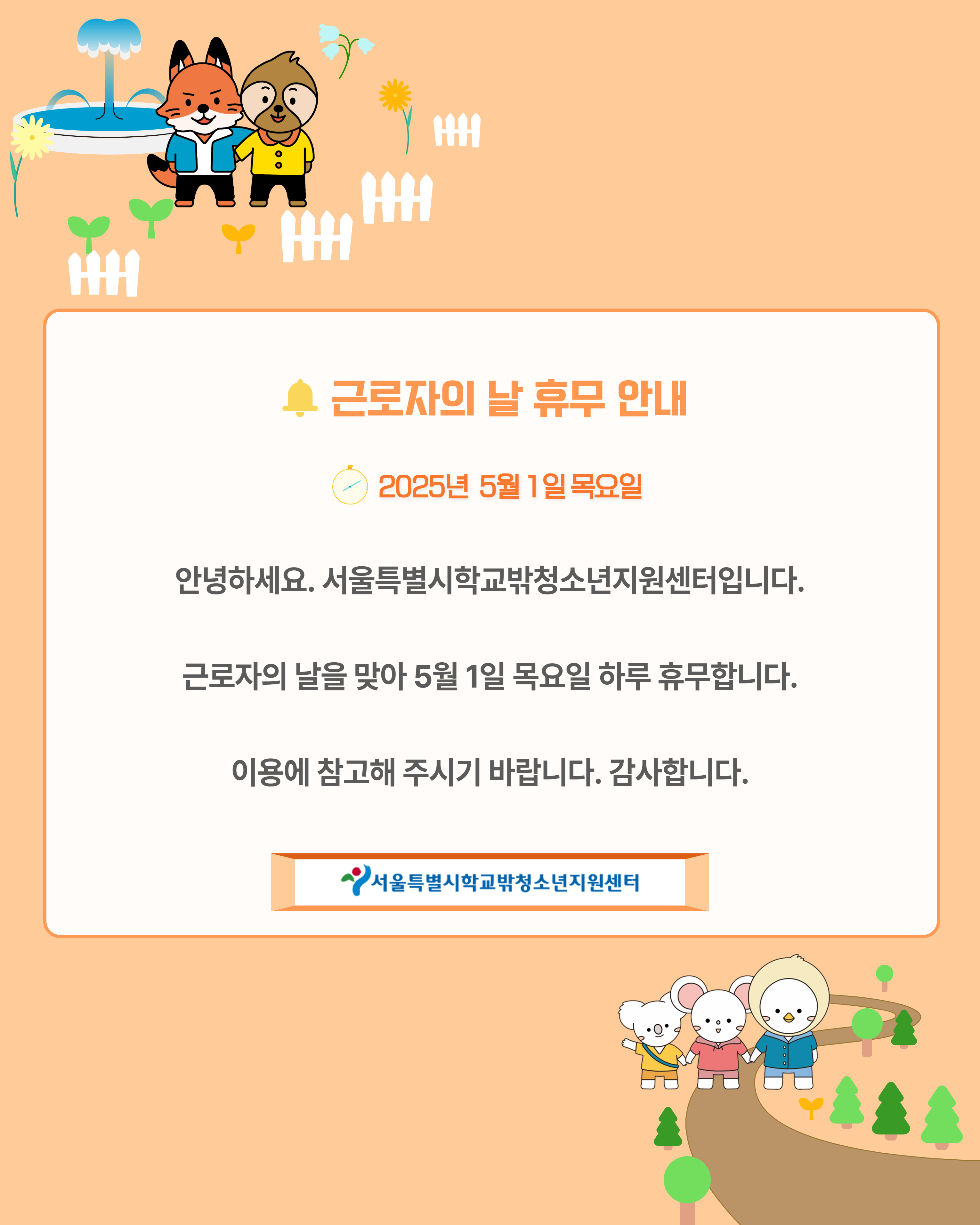 공지사항 HOME > 커뮤니티 > 센터 소식 > 공지사항 링크공유 프린트 근로자의 날 휴무 안내(20250501) 관리자 0 290 0 0 Print 글주소 04-29 근로자의날 휴무일 안내일시: 2025년 5월 1일 09:00-18:00안녕하세요. 서울특별시학교밖청소년지원센터입니다.근로자의 날을 맞아 5월 1일 목요일 하루 휴무합니다.이용에 참고 부탁드립니다. 0 0 스크랩 목록 이전글 다음글 제목+내용 제목 내용 회원명 회원아이디 번호 제목 글쓴이 날짜 조회수 공지 정책단 '다움' Crew 모집 안내 관리자 02-23 55 공지 2026년 학교 밖 청소년 인식개선 온라인 이벤트 1차 관리자 02-12 361 공지 [서울특별시학교밖청소년지원센터] 찾아오는 길 안내_보라매공원역편 관리자 08-25 2,932 492 2025년 제2회 초·중·고등학교 졸업학력 검정고시 시행계획 공고 관리자 06-12 606 491 현충일 휴무 안내(20250606) 관리자 06-05 310 490 제21대 대통령선거 휴무 안내(20250603) 관리자 06-02 284 489 [인턴십] 2025년 기업가정신 해외탐방(일본편) 참가자모집 관리자 05-21 2,021 488 어린이날, 부처님오신날 대체공휴일 휴무 안내(20250505-0506) 관리자 05-02 342 487 근로자의 날 휴무 안내(20250501) 관리자 04-29 291 486 2024년 서울특별시학교밖청소년지원센터 시보조금 결산내역서 관리자 04-22 389 485 센터 사무실 공사로 인한 업무 제한 안내(20250410) 관리자 04-09 386 484 (※2025년 지원 마감) 2025년 학업지원 사업 [안내문 및 신청서식] 관리자 04-01 12,741 483 2025년 학교 밖 청소년 수업료 지원(1차) 모집(사회적 배려대상자) 관리자 03-31 1,459 482 2025년 학교 밖 청소년 인식개선 온라인 이벤트 1차 당첨자 발표 관리자 03-26 1,159 481 [마감]2025년 학교 밖 청소년 찾아가는 상담 및 심리검사 무료지원 신청안내 관리자 03-12 3,787 480 2025년 상반기 문주장학생 추천 안내(모집완료) 관리자 02-10 1,649 479 서울특별시학교밖청소년지원센터 2025년 예산내역 공고 관리자 01-15 818 478 2024년 서울특별시학교밖청소년지원센터 하반기(7~12월) 수의계약 내역 관리자 01-07 569 477 2025년 새해 인사 관리자 12-31 608 476 2024년 인턴십활동 종료 관리자 12-26 940 475 서울특별시학교밖청소년지원센터 2024년 3차 전용 예산내역 공고 관리자 12-26 421 474 센터 크리스마스 휴무 안내 관리자 12-23 388 473 2025학년도 대학수학능력시험 센터 출근시간 조정 안내 관리자 11-13 465 목록 <12345678>맨끝 ›