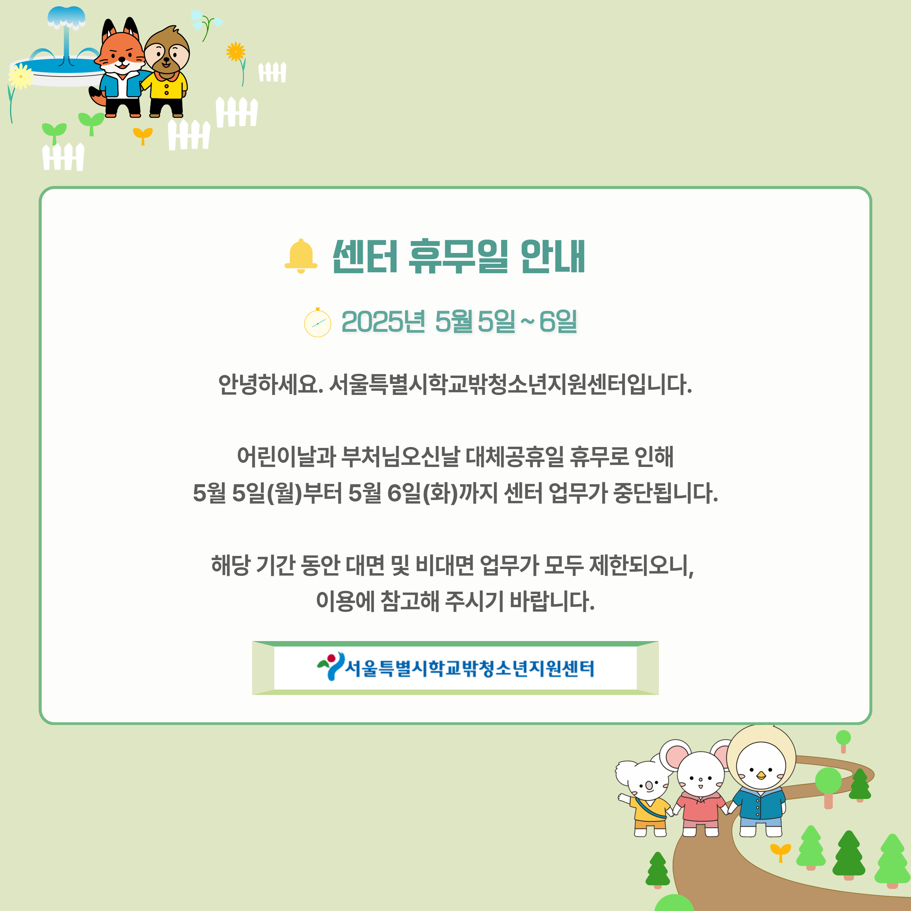 공지사항 HOME > 커뮤니티 > 센터 소식 > 공지사항 링크공유 프린트 어린이날, 부처님오신날 대체공휴일 휴무 안내(20250505-0506) 관리자 0 341 0 0 Print 글주소 05-02 안녕하세요. 서울특별시학교밖청소년지원센터입니다.어린이날과 부처님오신날 대체공휴일 휴무로 인해5월 5일(월)부터 5월 6일(화)까지 센터 업무가 중단됩니다.해당 기간 동안 대면 및 비대면 업무가 모두 제한되오니, 이용에 참고해 주시기 바랍니다. 0 0 스크랩 목록 이전글 다음글 제목+내용 제목 내용 회원명 회원아이디 번호 제목 글쓴이 날짜 조회수 공지 정책단 '다움' Crew 모집 안내 관리자 02-23 54 공지 2026년 학교 밖 청소년 인식개선 온라인 이벤트 1차 관리자 02-12 358 공지 [서울특별시학교밖청소년지원센터] 찾아오는 길 안내_보라매공원역편 관리자 08-25 2,929 492 2025년 제2회 초·중·고등학교 졸업학력 검정고시 시행계획 공고 관리자 06-12 606 491 현충일 휴무 안내(20250606) 관리자 06-05 309 490 제21대 대통령선거 휴무 안내(20250603) 관리자 06-02 283 489 [인턴십] 2025년 기업가정신 해외탐방(일본편) 참가자모집 관리자 05-21 2,021 488 어린이날, 부처님오신날 대체공휴일 휴무 안내(20250505-0506) 관리자 05-02 342 487 근로자의 날 휴무 안내(20250501) 관리자 04-29 290 486 2024년 서울특별시학교밖청소년지원센터 시보조금 결산내역서 관리자 04-22 388 485 센터 사무실 공사로 인한 업무 제한 안내(20250410) 관리자 04-09 385 484 (※2025년 지원 마감) 2025년 학업지원 사업 [안내문 및 신청서식] 관리자 04-01 12,741 483 2025년 학교 밖 청소년 수업료 지원(1차) 모집(사회적 배려대상자) 관리자 03-31 1,459 482 2025년 학교 밖 청소년 인식개선 온라인 이벤트 1차 당첨자 발표 관리자 03-26 1,159 481 [마감]2025년 학교 밖 청소년 찾아가는 상담 및 심리검사 무료지원 신청안내 관리자 03-12 3,786 480 2025년 상반기 문주장학생 추천 안내(모집완료) 관리자 02-10 1,649 479 서울특별시학교밖청소년지원센터 2025년 예산내역 공고 관리자 01-15 818 478 2024년 서울특별시학교밖청소년지원센터 하반기(7~12월) 수의계약 내역 관리자 01-07 568 477 2025년 새해 인사 관리자 12-31 607 476 2024년 인턴십활동 종료 관리자 12-26 940 475 서울특별시학교밖청소년지원센터 2024년 3차 전용 예산내역 공고 관리자 12-26 420 474 센터 크리스마스 휴무 안내 관리자 12-23 388 473 2025학년도 대학수학능력시험 센터 출근시간 조정 안내 관리자 11-13 464 목록 <12345678>맨끝 ›