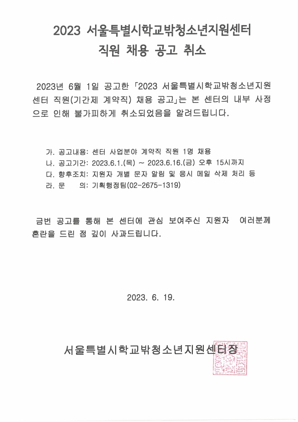 2023 서울특별시학교밖청소년지원센터 직원 채용 공고 취소 안내
