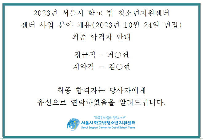 2023 서울특별시학교밖청소년지원센터 사업분야 직원(정규직, 계약직) 채용 최종합격자 발표 안내(2023.10.24. 면접건)