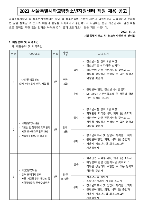 167 2023 서울특별시학교밖청소년지원센터 직원(부장) 채용 공고 관리자 12-15 642