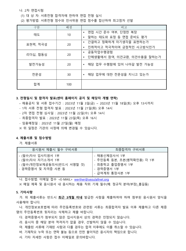158 2023 서울특별시학교밖청소년지원센터 직원(정규직, 계약직) 채용 1차 서류 합격자 발표 안내 (2023.10.05. 공고건) 관리자 10-23 447