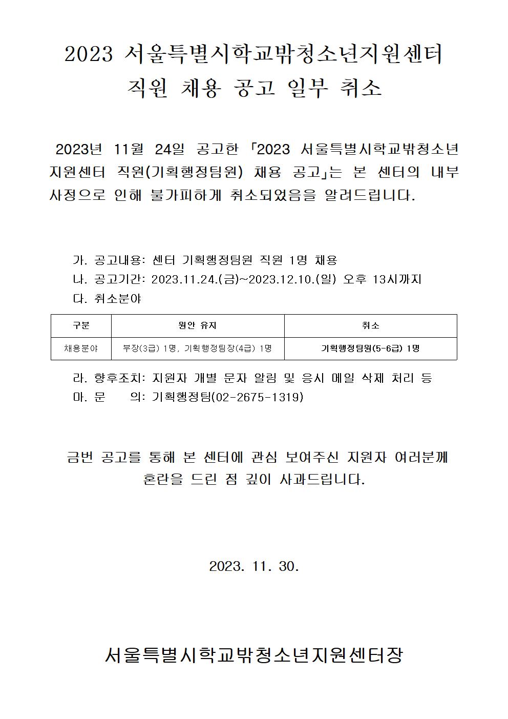 2023 서울특별시학교밖청소년지원센터 직원 채용 공고 일부 취소