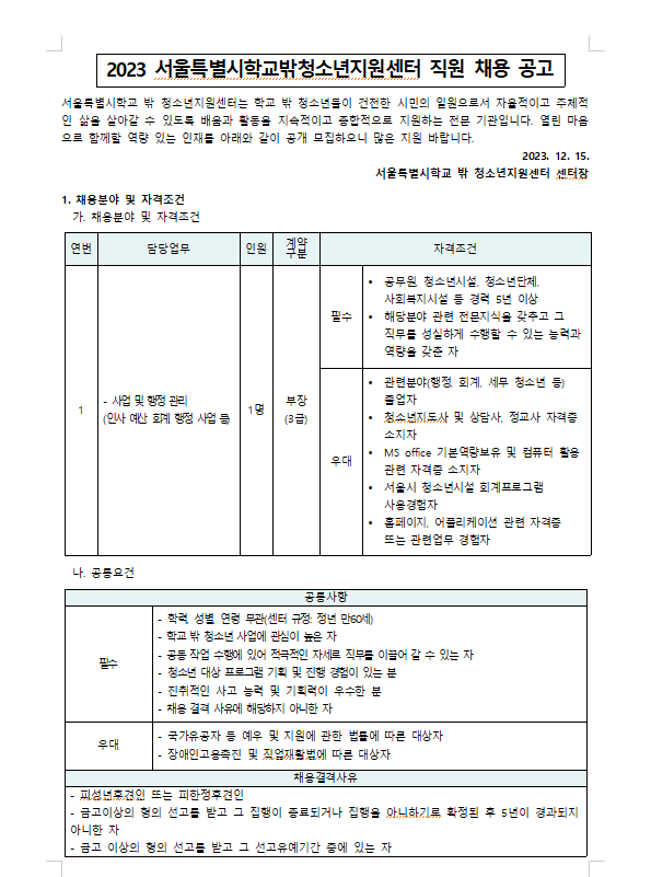167 2023 서울특별시학교밖청소년지원센터 직원(부장) 채용 공고 관리자 12-15 642