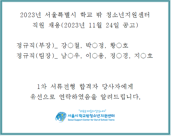 2023 서울특별시학교밖청소년지원센터 직원 채용 1차 서류 합격자 발표 안내 (2023.11.24. 공고건)