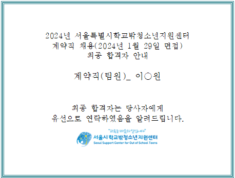 2024 서울특별시학교밖청소년지원센터 직원(기간제 계약직) 채용 최종 합격자 발표 안내 (2024.1.29. 면접건)