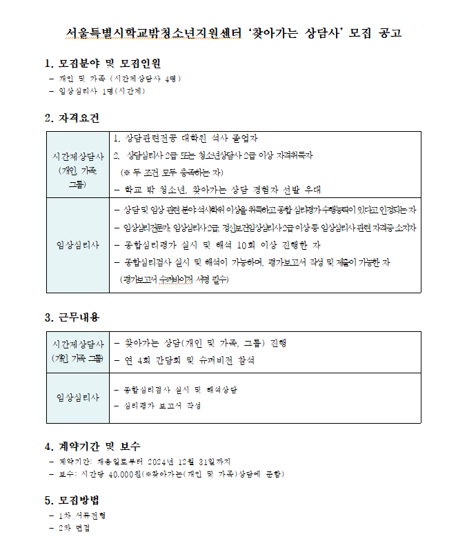 2024년 서울특별시학교밖청소년지원센터 '찾아가는 상담사' 추가채용 모집 공고
