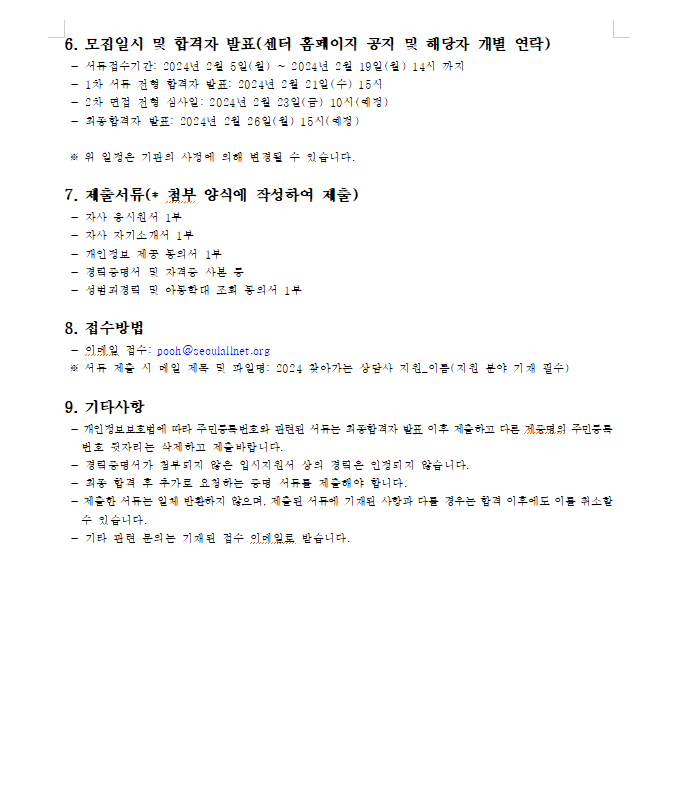 2024 서울특별시학교밖청소년지원센터 직원 채용 1차 서류 합격자 발표 안내(2024.2.13.공고건)
