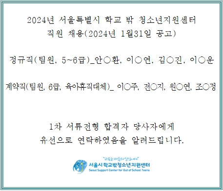 2024 서울특별시학교밖청소년지원센터 직원(정규직, 육아휴직대체 계약직) 채용 1차 서류 합격자 발표 안내 (2024.1.31. 공고건)