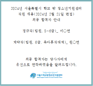 2024 서울특별시학교밖청소년지원센터 직원 채용 최종합격자 발표 안내(2024.3.6.면접건)