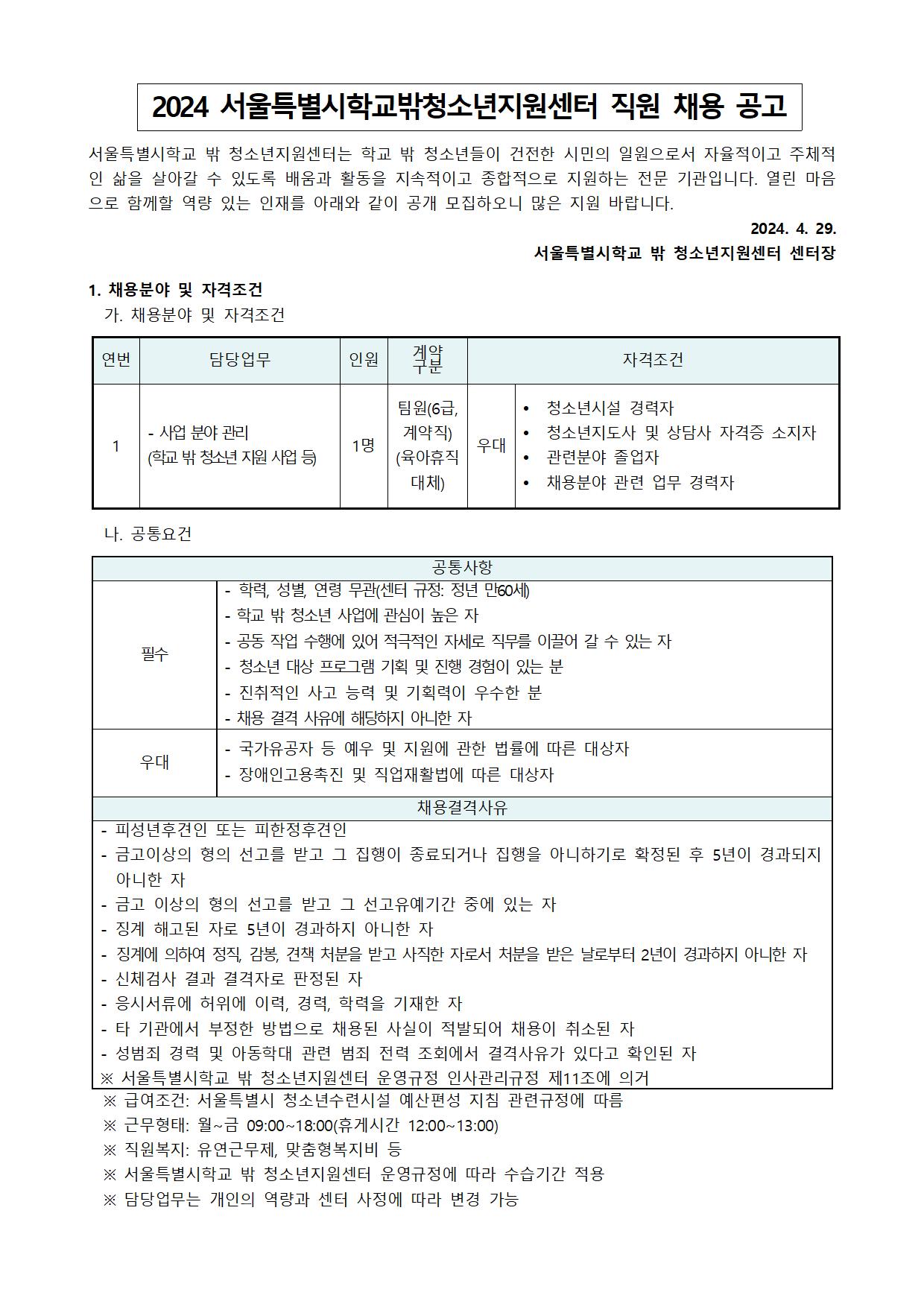 2024 서울특별시학교밖청소년지원센터 직원(계약직) 채용 최종합격자 발표 안내(2024.5.20.면접건)