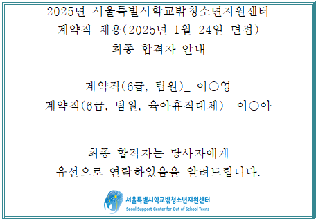2025년 서울특별시학교밖청소년지원센터 직원(계약직) 채용 최종합격자 발표 안내(2025.1.24.면접건)