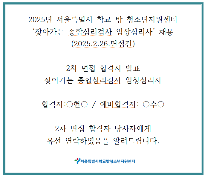 2025년 서울특별시학교밖청소년지원센터 ’찾아가는 종합심리검사 임상심리사‘ 채용 최종합격자 발표 안내(2025.2.26.면접건)