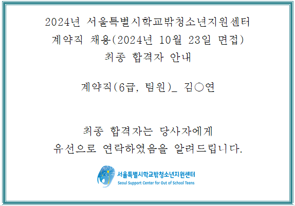 2024 서울특별시학교밖청소년지원센터 직원(계약직) 채용 최종합격자 발표 안내(2024.11.13.면접건)