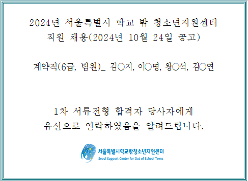 2024 서울특별시학교밖청소년지원센터 직원(계약직) 채용 1차 서류 합격자 발표 안내 (2024.10.24. 공고건)