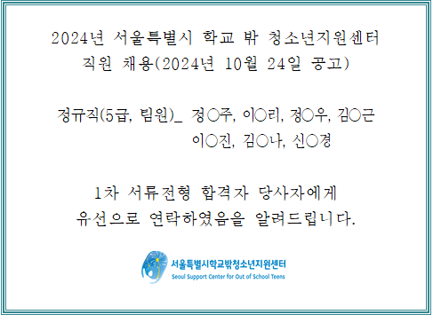 2024 서울특별시학교밖청소년지원센터 직원(정규직) 채용 1차 서류 합격자 발표 안내 (2024.10.24. 공고건)