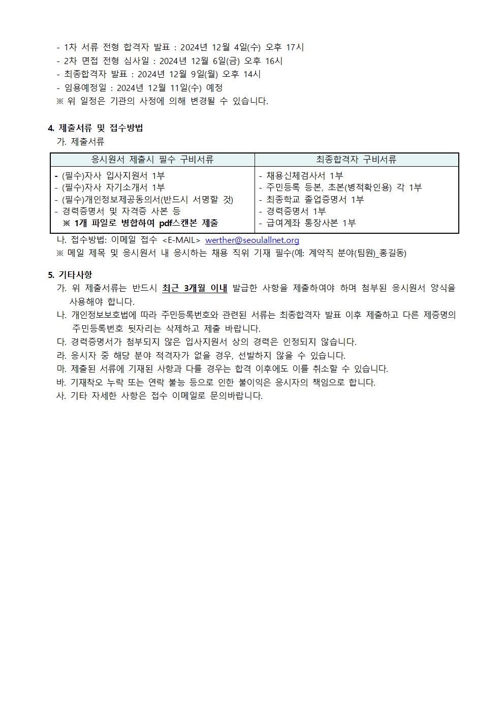 2024년 서울특별시학교밖청소년지원센터 직원(계약직) 채용 1차 서류 합격자 발표 안내 (2024.12.11. 공고건)