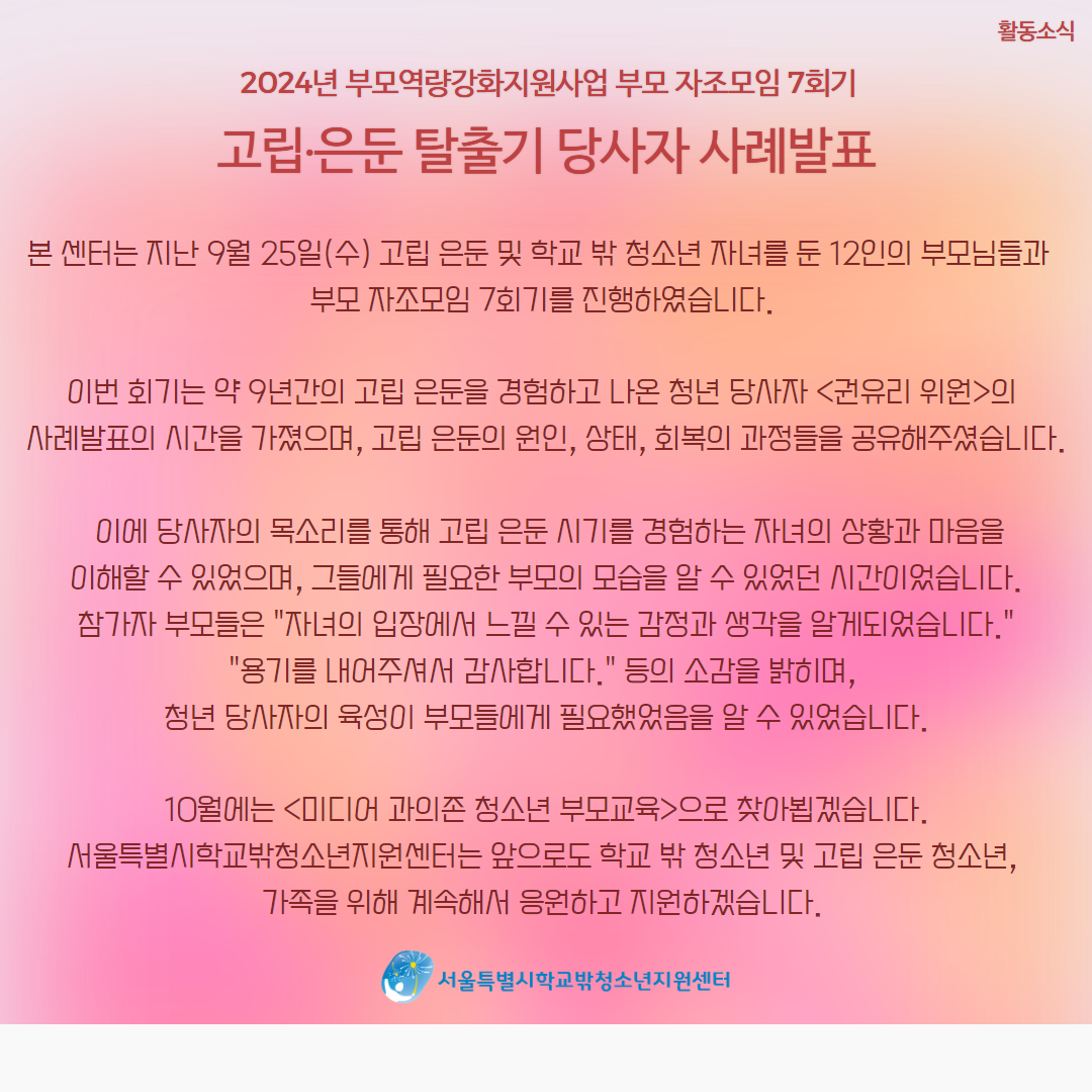 활동소식 HOME > 커뮤니티 > 센터 소식 > 활동소식 링크공유 프린트 2024년 부모역량강화지원사업 부모 자조모임 7회기 -고립은둔 청년 당사자 사례발표- 관리자 0 363 0 0 Print 글주소 10-16 0 0 스크랩 목록 이전글 다음글