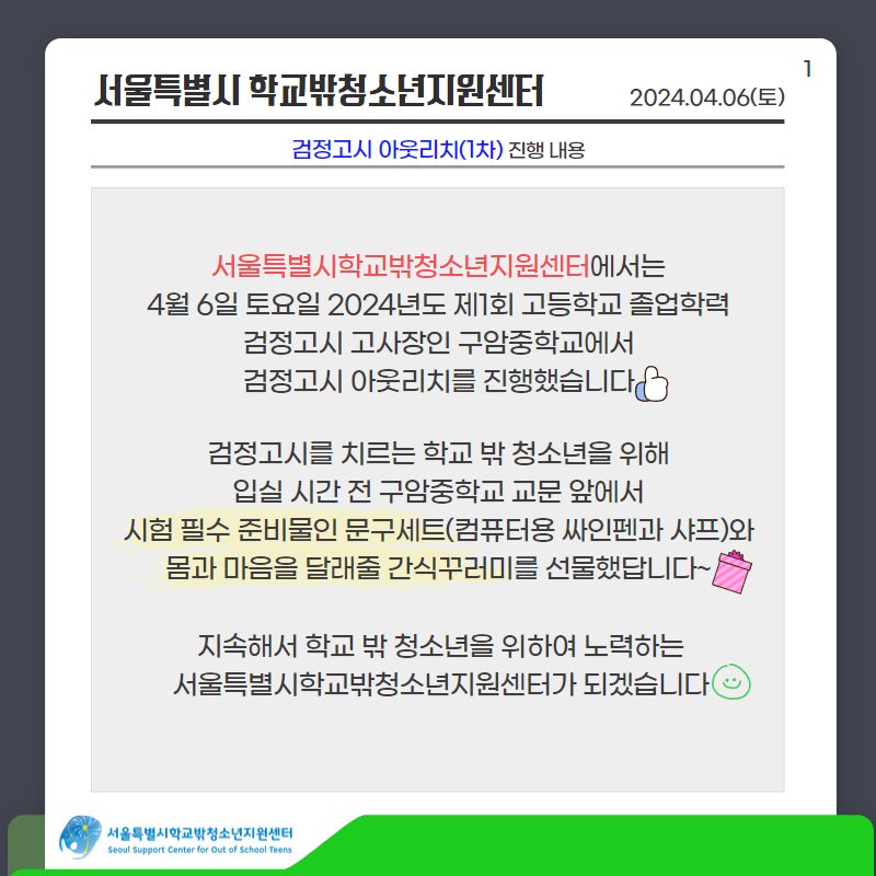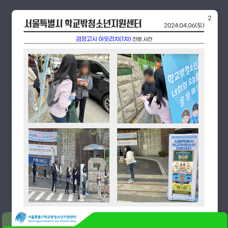 활동소식 HOME > 커뮤니티 > 센터 소식 > 활동소식 링크공유 프린트 2024년 학교 밖 청소년 검정고시 아웃리치(1차) 진행 관리자 0 302 0 0 Print 글주소 04-12 0 0 스크랩 목록 이전글 다음글