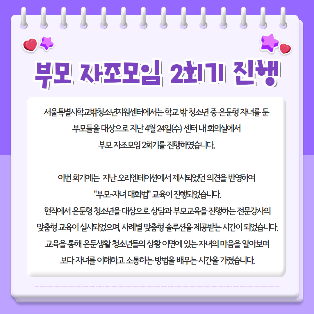 활동소식 HOME > 커뮤니티 > 센터 소식 > 활동소식 링크공유 프린트 2024년 서울특별시학교밖청소년지원센터 부모 자조모임 2회기 진행 관리자 0 225 0 0 Print 글주소 05-07 0 0 스크랩 목록 이전글 다음글