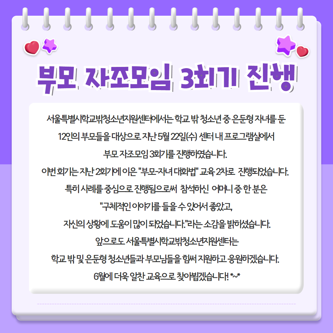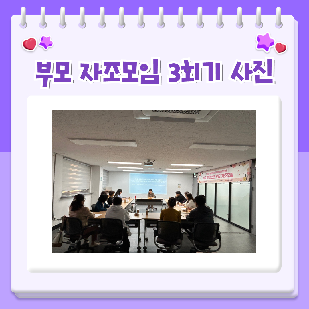 활동소식 HOME > 커뮤니티 > 센터 소식 > 활동소식 링크공유 프린트 2024년 서울특별시학교밖청소년지원센터 부모 자조모임 3회기 진행 관리자 0 272 0 0 Print 글주소 05-24 *상시로 모집을 진행하고 있으니 관심있는 부모님들께서는 언제든 신청해주세요!(문의: 루시 070-4281-5648)2024년 부모 자조모임 추가모집 신청서 - Google Forms 0 0 스크랩 목록 이전글 다음글