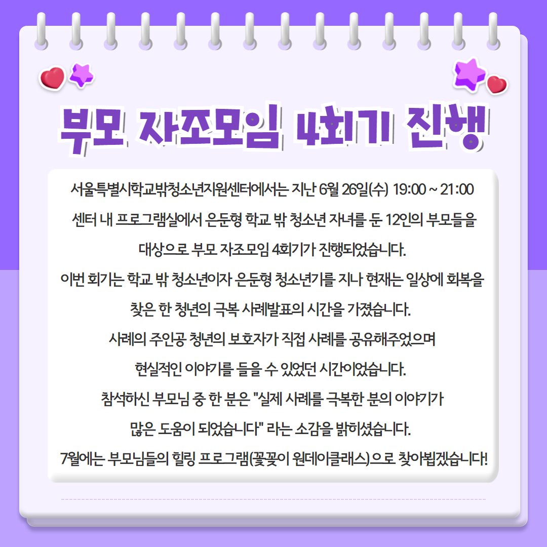 활동소식 HOME > 커뮤니티 > 센터 소식 > 활동소식 링크공유 프린트 2024년 부모 자조모임 4회기 '은둔극복사례발표' 관리자 0 269 0 0 Print 글주소 06-28 0 0 스크랩 목록 이전글 다음글
