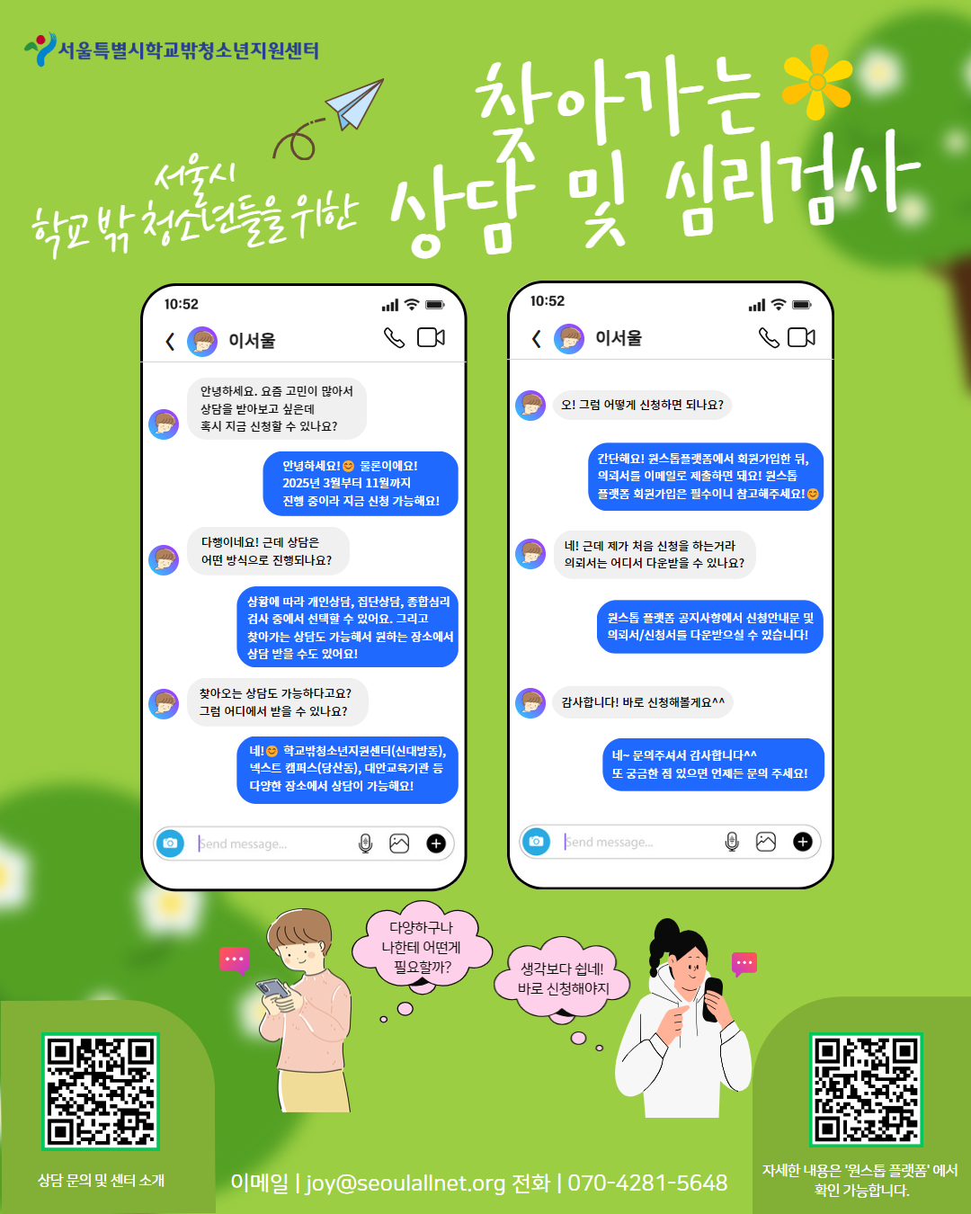 ○ 서울특별시학교밖청소년지원센터에서 진행하는 ‘찾아가는 상담’은 센터의 전문상담사가 지정된 상담 장소로 찾아가는 상담입니다.