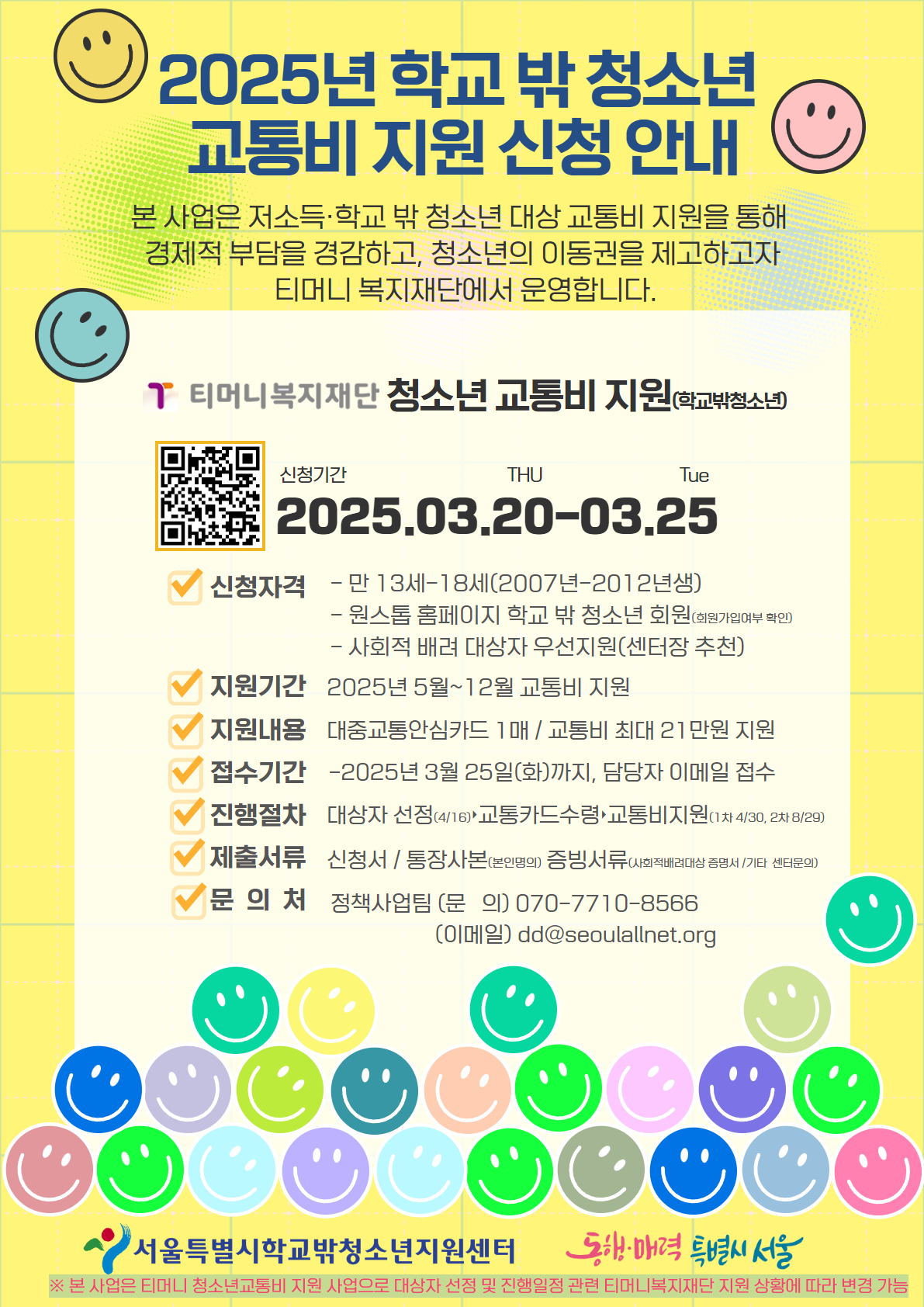프로그램 신청 HOME > 프로그램 > 프로그램 신청 링크공유 프린트 <접수마감>2025 학교밖청소년 교통비지원 대상 모집 인원 프로그램 기간 2025-03-20 ~ 2025-03-25 신청 기간 2025-03-20 ~ 2025-03-25 장소 서울특별시학교밖청소년지원센터 방식 온라인 원스톱 프로그램 내용 [바로가기] 2025년 학교 밖 청소년 교통비 지원 신청서 다운로드 첨부파일 목록
