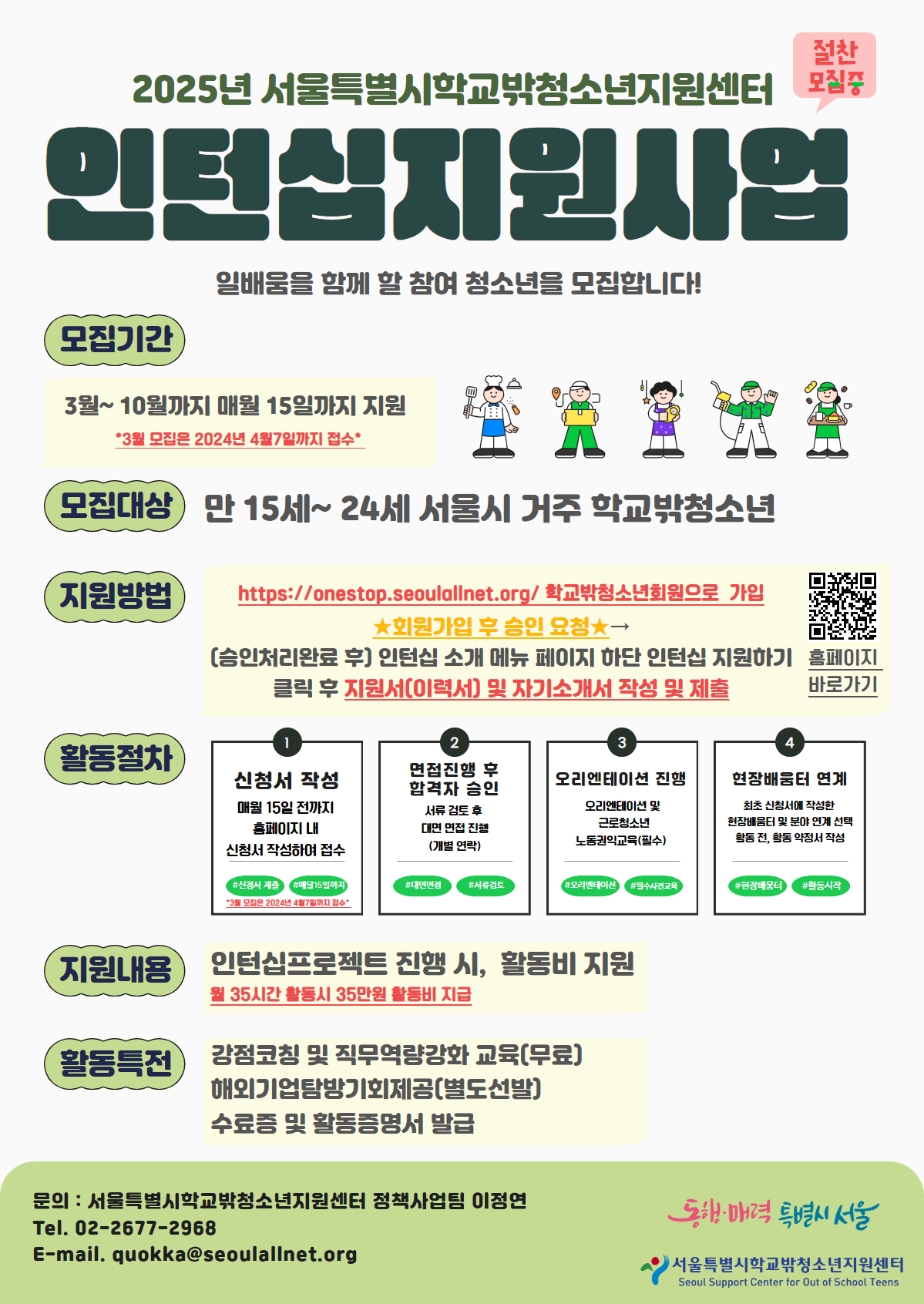 프로그램 신청 HOME > 프로그램 > 프로그램 신청 링크공유 프린트 2025년 인턴십프로젝트 참가자 모집 대상 모집 인원 프로그램 기간 2025-04-14 ~ 2025-11-30 신청 기간 2025-03-21 ~ 2025-10-31 장소 서울특별시학교밖청소년지원센터 방식 오프라인 원스톱 프로그램 내용 인턴십 참여희망자는 ★인턴십프로젝트소개★ 클릭 후 페이지 하단 인턴십 신청하기를 통해 이력서 및 자기소개서 작성하여 제출해야 최종 인터십 신청이 됩니다![바로가기] 인턴십프로젝트 안내문 바로가기 첨부파일 목록
