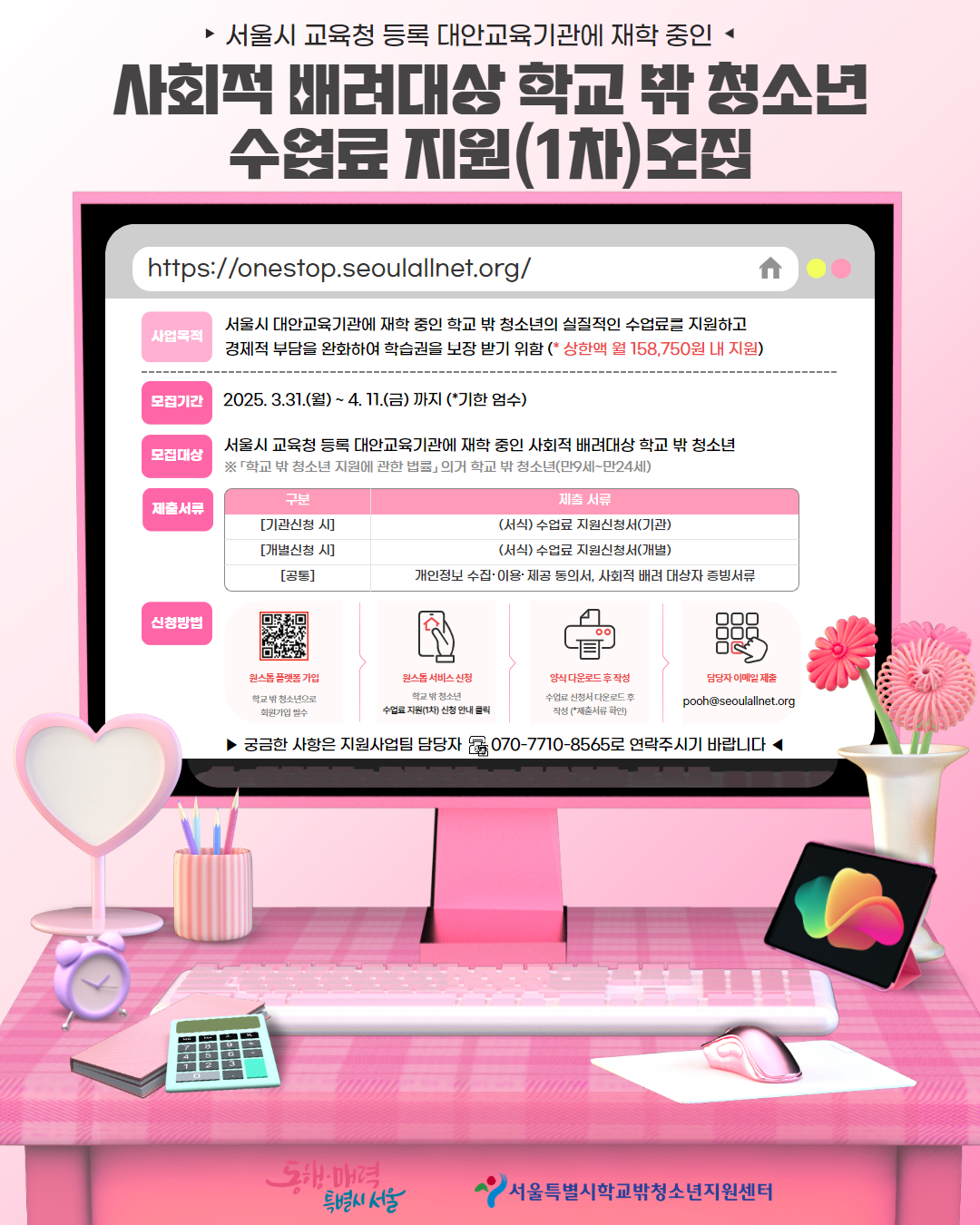 【문 의 처】서울특별시학교밖청소년지원센터 지원사업팀 (수업료지원 담당자) ☎ 문의 및 상담 : 070-7710-8565 |