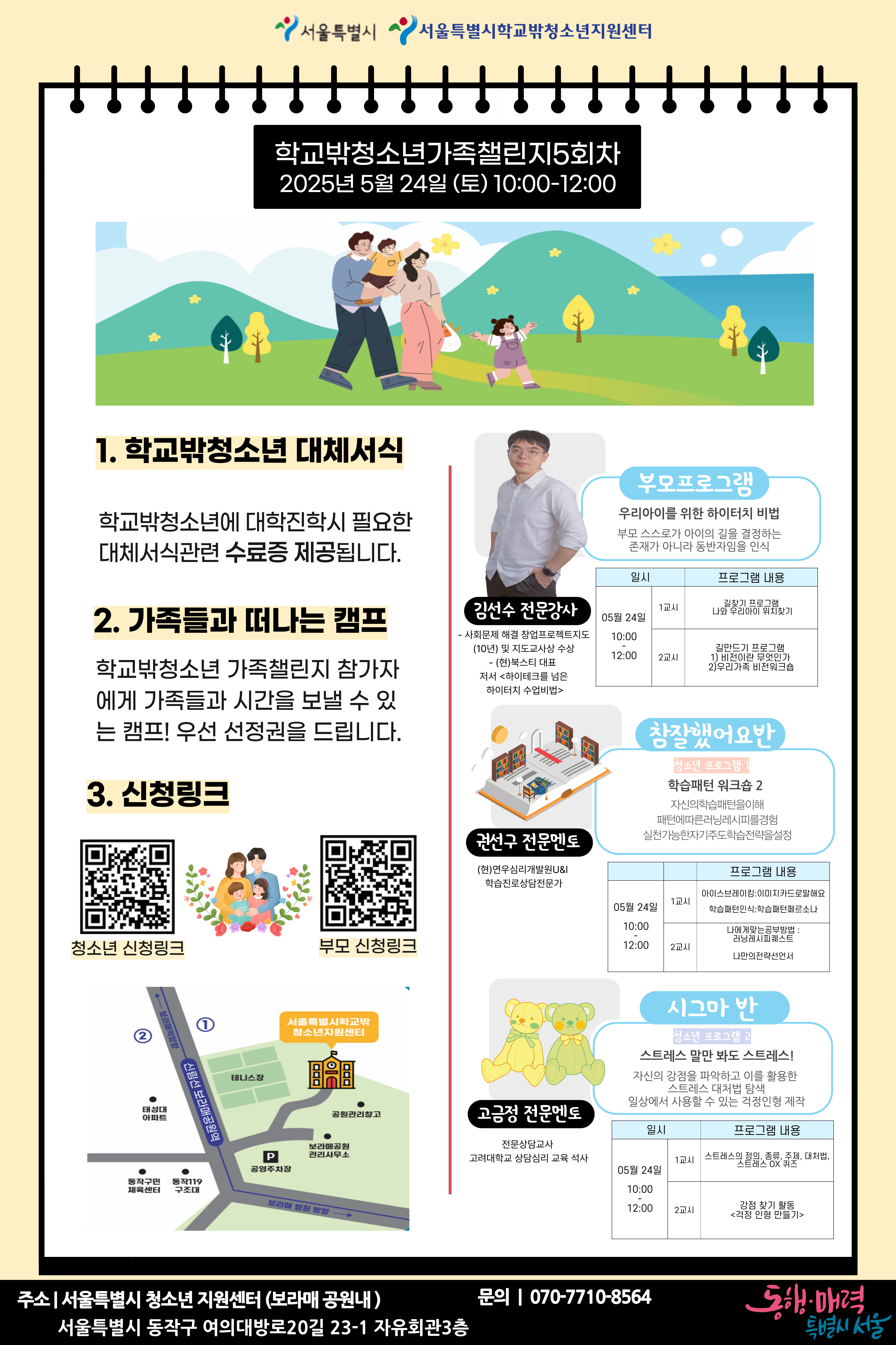 프로그램 신청 HOME > 프로그램 > 프로그램 신청 링크공유 프린트 학교밖청소년 가족챌린지 5차시 대상 모집 인원 프로그램 기간 2025-05-24 ~ 2025-05-24 [토]10:00~ 12:00 신청 기간 2025-05-16 ~ 2025-05-23 장소 서울특별시학교밖청소년지원센터 방식 오프라인 원스톱 프로그램 내용 전체 프로그램 신청링크 : https://forms.gle/UHxQ8H5YxvjCwHRC7당일형 프로그램은 큐알코드로 신청부탁드립니다:-) 첨부파일 목록