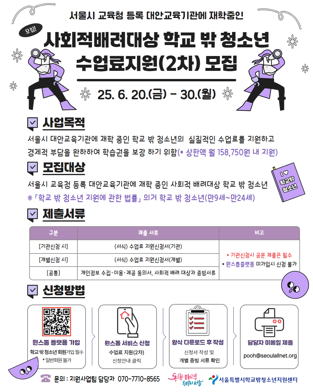 2025년 학교 밖 청소년 수업료 지원(2차) 신청 안내