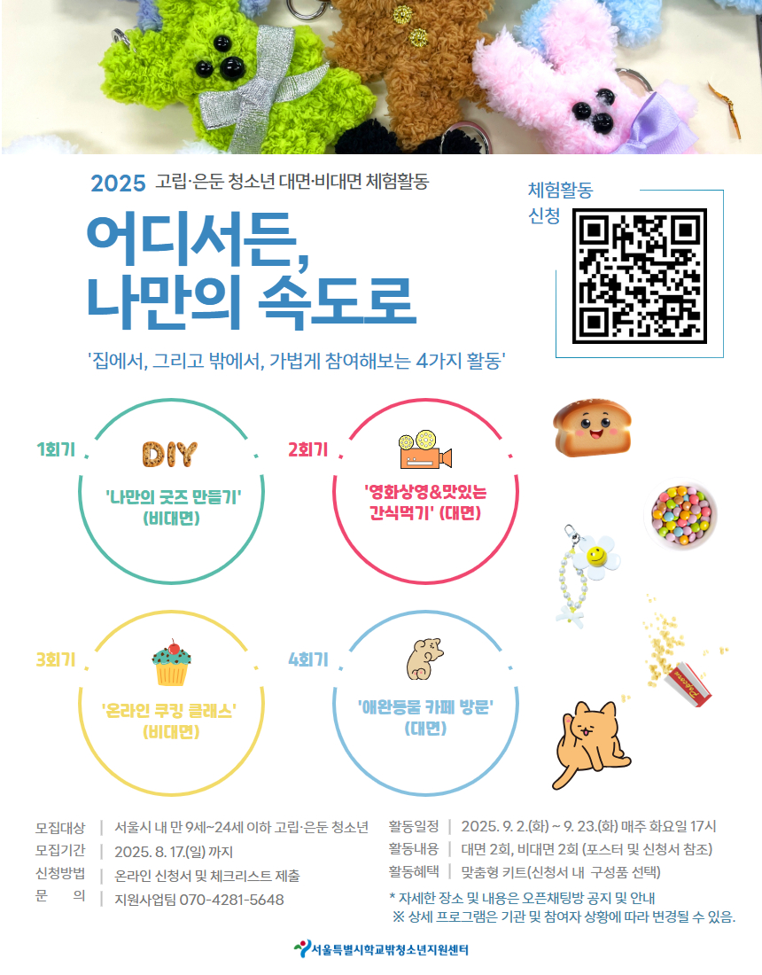 고립‧은둔 청소년을 위한 대면·비대면 체험활동「어디서든, 나만의 속도로」프로그램 안내드립니다.