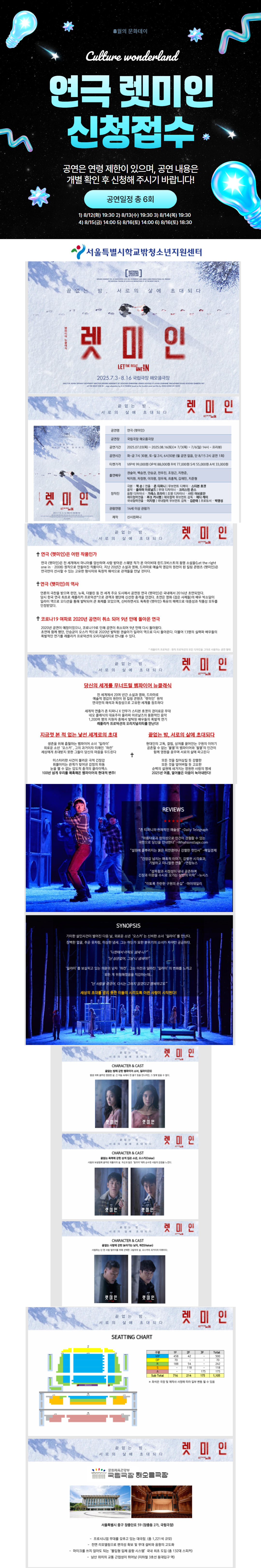 프로그램 신청 HOME > 프로그램 > 프로그램 신청 링크공유 프린트 [8월 2차] 문화예술 공연 신청 안내 대상 모집 인원 프로그램 기간 2025-08-12 ~ 2025-08-16 신청 기간 2025-08-08 ~ 2025-08-13 장소 방식 온라인 원스톱 프로그램 내용 <8월 2차 문화예술관람 지원 신청서> (신청링크 바로가기) https://forms.gle/7bGK4kCA7HoxaMTGA연극 렛미인https://www.iseensee.com/Home/Perf/PerfDetail.aspx?IdPerf=1207 신청완료 설문지 "제출" 완료 후에 "신청완료" 버튼을 눌러 신청 해주세요. 첨부파일 프로그램 신청 목록