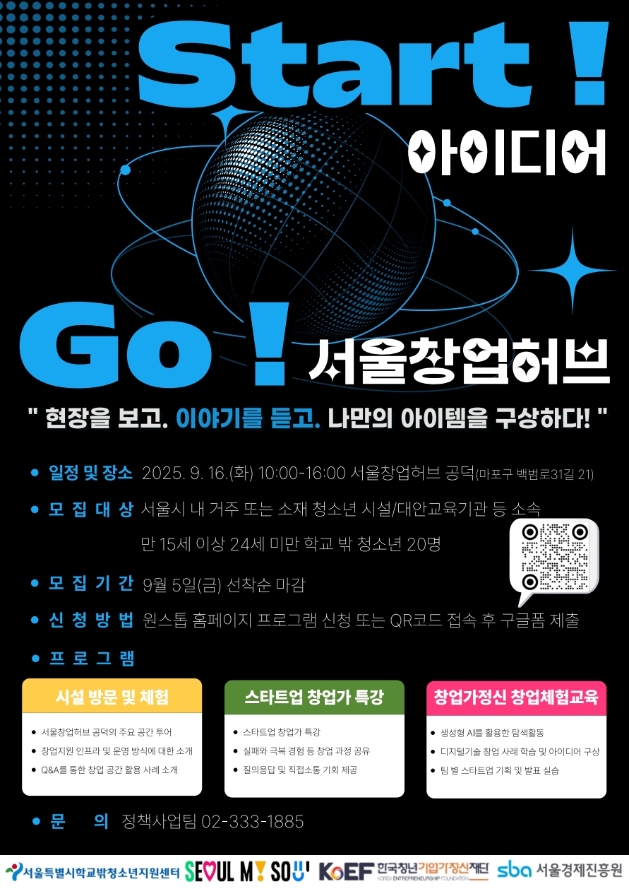 프로그램 신청 HOME > 프로그램 > 프로그램 신청 링크공유 프린트 START ! 아이디어 GO! 창업허브 대상 모집 인원 프로그램 기간 2025-09-16 ~ 2025-09-16 신청 기간 2025-08-22 ~ 2025-09-05 장소 서울창업허브공덕 방식 오프라인 원스톱 프로그램 내용 신청완료 설문지 "제출" 완료 후에 "신청완료" 버튼을 눌러 신청 해주세요. 첨부파일 프로그램 신청 목록