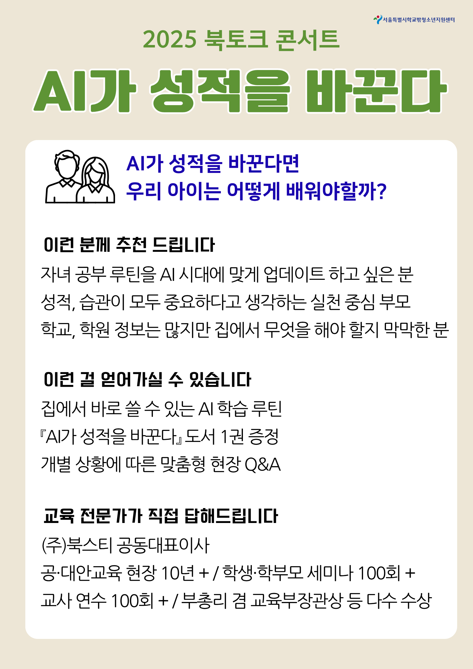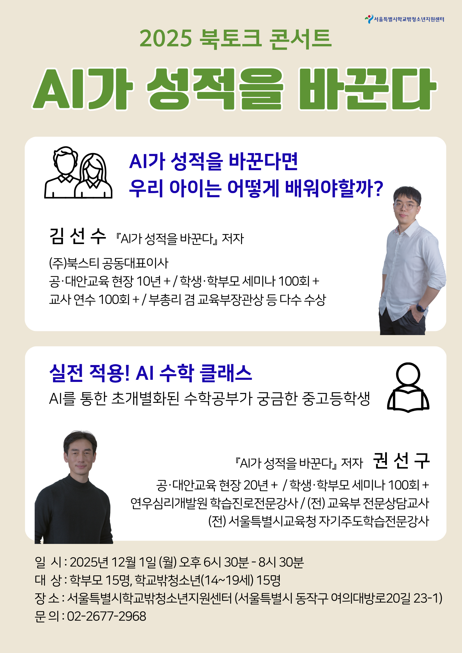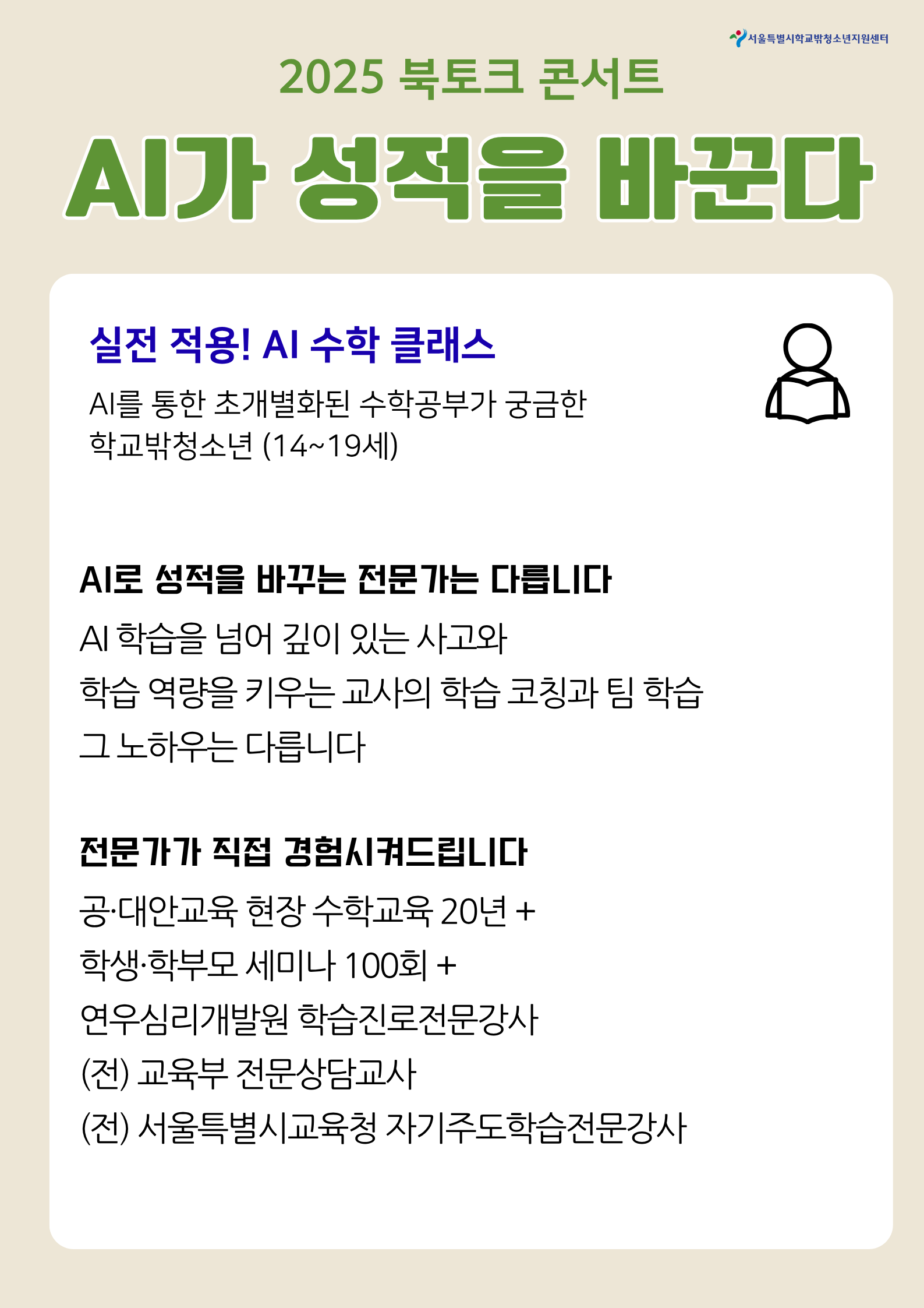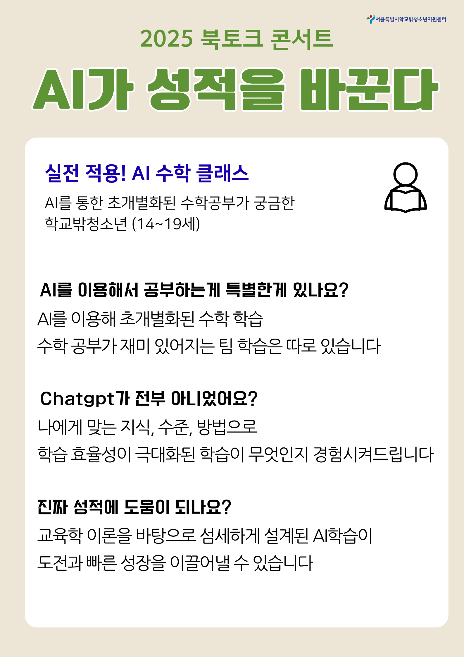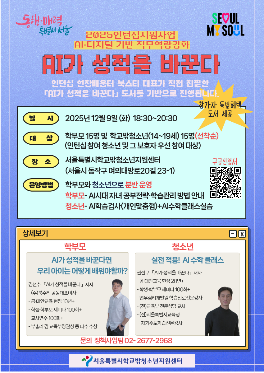 프로그램 신청 HOME > 프로그램 > 프로그램 신청 링크공유 프린트 (수정) 「AI가 성적을 바꾼다」강연 및 AI수학클래스 대상 모집 인원 프로그램 기간 2025-12-09 ~ 2025-12-09 [화]18:30~ 20:30 신청 기간 2025-11-15 ~ 2025-12-05 장소 서울시학교밖청소년지원센터 방식 오프라인 원스톱 프로그램 내용 신청완료 설문지 "제출" 완료 후에 "신청완료" 버튼을 눌러 신청 해주세요. 첨부파일 프로그램 신청 목록