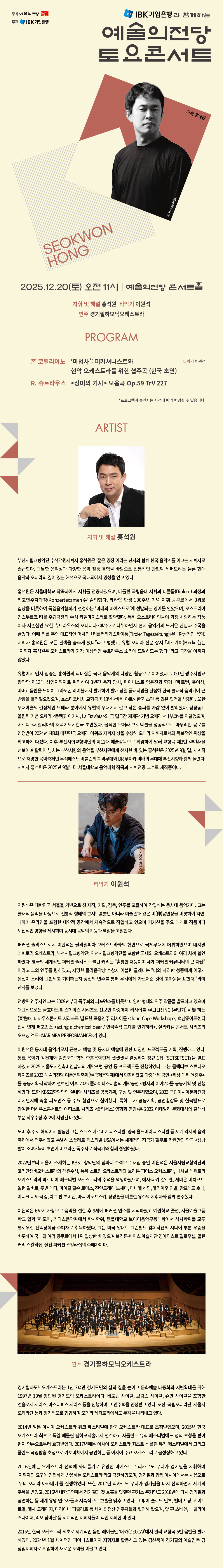 프로그램 신청 HOME > 프로그램 > 프로그램 신청 링크공유 프린트 12월 문화예술관람지원 신청(예술의전당 토요콘서트) 대상 모집 인원 프로그램 기간 2025-12-20 ~ 2025-12-20 신청 기간 2025-12-12 ~ 2025-12-12 장소 방식 온라인 원스톱 프로그램 내용 <본 공연은 40명 까지 선착순 접수이며, 정원 외 신청하신 경우는 대기명단으로 접수됩니다> 신청완료 설문지 "제출" 완료 후에 "신청완료" 버튼을 눌러 신청 해주세요. 첨부파일 프로그램 신청 목록