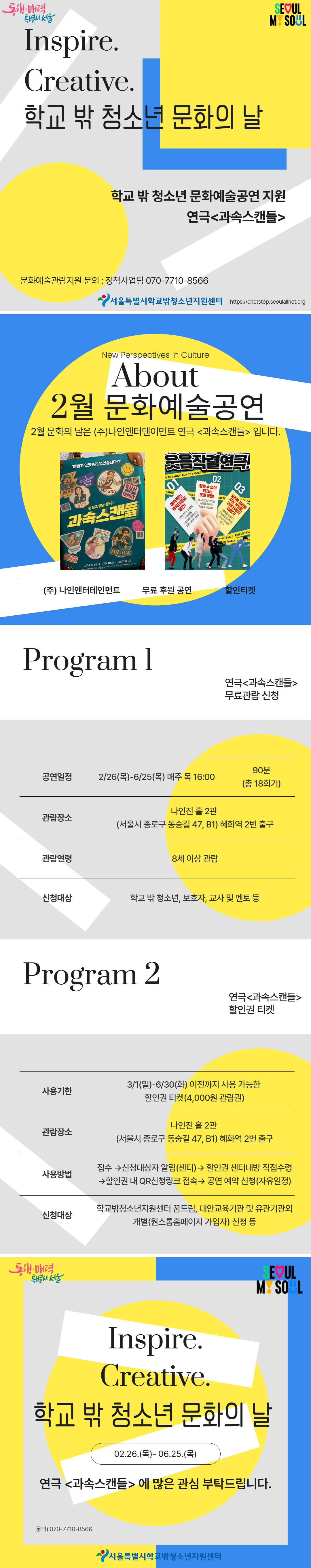 센터에서는 매월 학교 밖 청소년 및 보호자를 대상으로 문화예술 공연을 지원하고 있습니다. 이에 문화예술 관람 공연인 ㈜나인엔터테인먼트 연극 <과속스캔들> 신청안내 드립니다. 무료공원 지원과 할인티켓 지원 두 가지 방법으로 신청 할 수 있습니다.