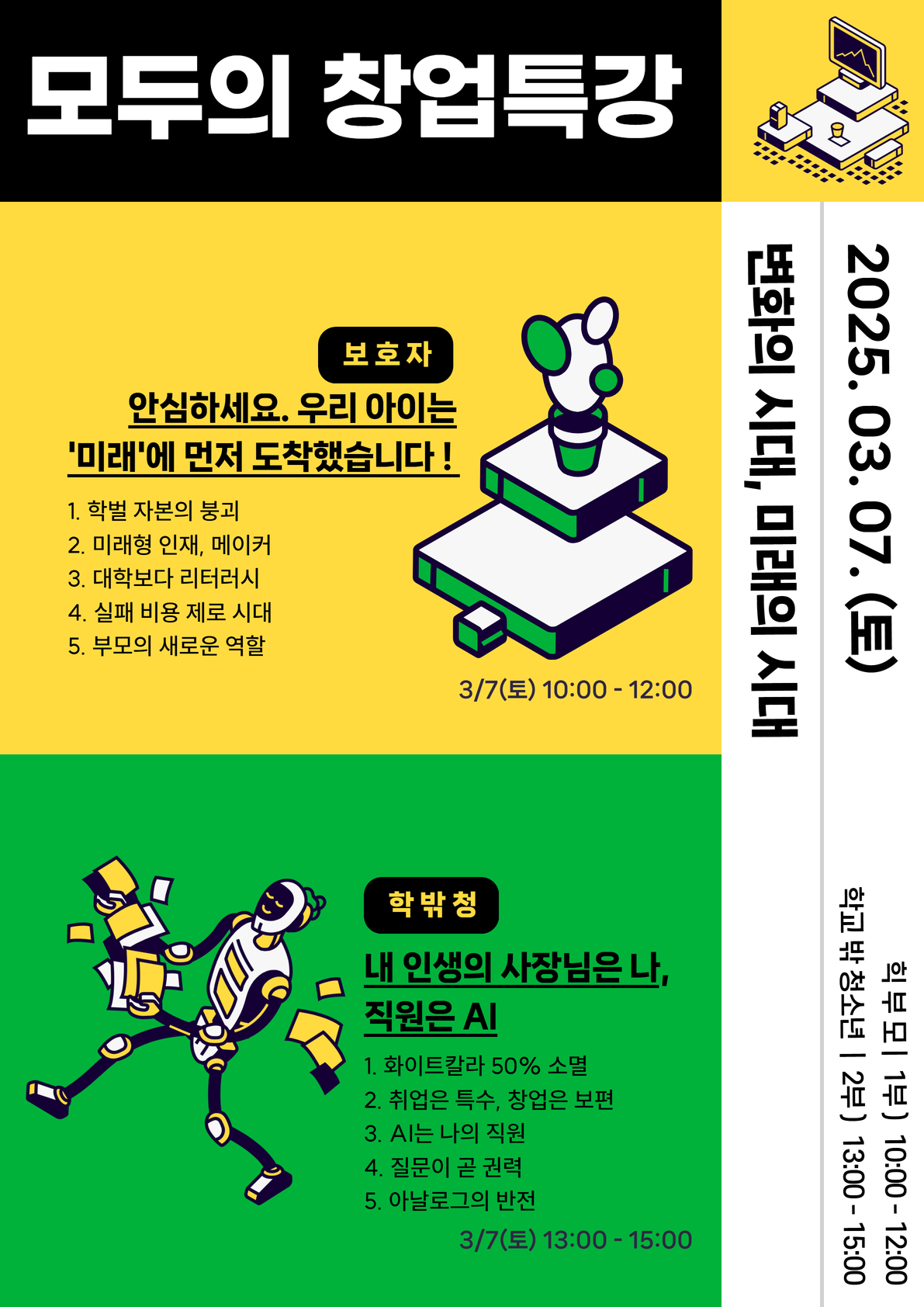 프로그램 신청 HOME > 프로그램 > 프로그램 신청 링크공유 프린트 모두의 창업특강 01<변화의 시대, 기회의 세대> 대상 학교 밖 청소년 및 보호자 모집 인원 각 20명 내외 프로그램 기간 2026-03-07 ~ 2026-03-07 신청 기간 2026-02-23 ~ 2026-03-06 장소 서울시학교밖청소년지원센터 방식 오프라인 원스톱 프로그램 내용 많은 관심과 참여 부탁드립니다 :-) 신청서 바로가기 신청완료 설문지 "제출" 완료 후에 "신청완료" 버튼을 눌러 신청 해주세요. 첨부파일 프로그램 신청 목록