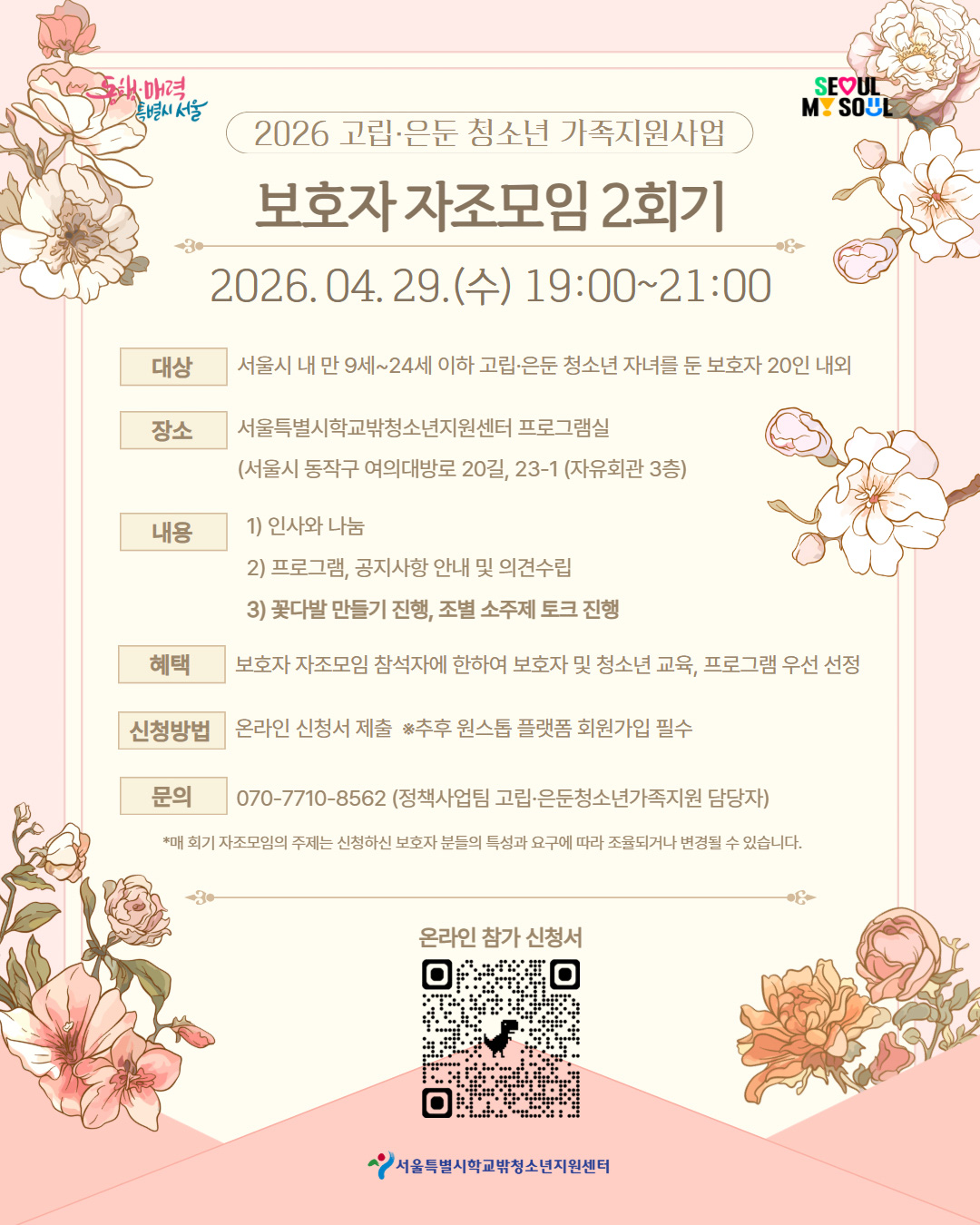 프로그램 신청 HOME > 프로그램 > 프로그램 신청 링크공유 프린트 2026년 고립·은둔청소년가족지원사업 보호자 자조모임 2회기 대상 서울시 내 만 9세~24세 이하 고립·은둔 청소년 자녀를 둔 보호자 모집 인원 20명 프로그램 기간 2026-04-29 ~ 2026-04-29 신청 기간 2026-04-22 ~ 2026-04-28 장소 서울시학교밖청소년지원센터 방식 오프라인 원스톱 프로그램 내용 신청완료 설문지 "제출" 완료 후에 "신청완료" 버튼을 눌러 신청 해주세요. 첨부파일 프로그램 신청 목록