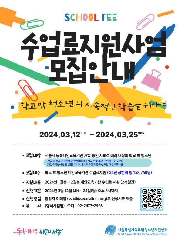 서울특별시학교밖청소년지원센터는 서울특별시 등록대안교육기관에 재학중인 사회적 배려 대상의 학교 밖 청소년이 지속적으로 학습을 이어갈 수 있도록 돕기 위해 학교 밖 청소년 수업료 지원 사업을 운영하고 있습니다.
